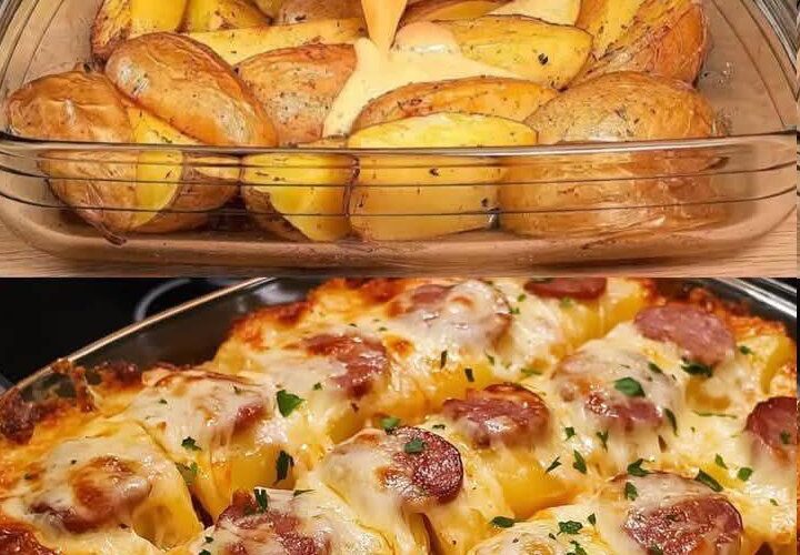 Hay recetas que no necesitan presentación porque hablan directamente al corazón. La cazuela de patatas al horno con queso y salchichas es una de ellas. Es ese tipo de plato que evoca hogar, mesas compartidas y aromas que llenan la cocina mientras el horno hace su magia. Sencilla, contundente y absolutamente deliciosa, esta receta combina ingredientes humildes para crear una experiencia culinaria que conquista desde el primer bocado.